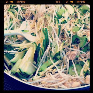 Einstweilen kann man schon die Füllung zubereiten. Das Tolle ist: Ihr könnt sie mit allem befüllen, was euch gut schmeckt. Ich habe für diese 120g Hühnerfleisch klein geschnitten und mit Öl angebraten. In die Pfanne kamen dann noch 1 feingeschnittene Zucchini, Sojasprossen, Stangensellerie und etwas Lauch. Die Mischung sollte dann zwar nicht fertig gebraten werden, aber relativ gar sein. Gewürzt habe ich mit: Roter Chili (lecker!), Knoblauch, Salz, Pfeffer, Ingwer und einer TK-Kräutermischung. Zum Schluss noch kleingewürfelte Feigen darunterheben. Die Füllung abkühlen lassen (etwa 20-30 Minuten – am besten die Pfanne/den Topf ins Waschbecken mit kaltem Wasser stellen).