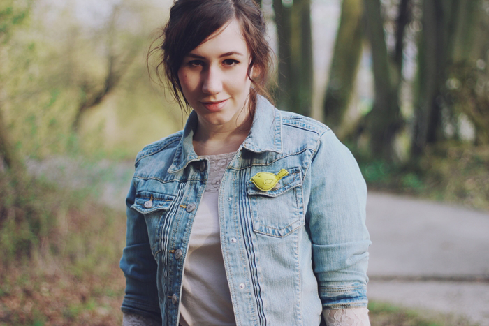 Rock: H&M // Spitzenshirt: H&M // Jeansjacke: Ernstings Family // Tasche: H&M // Schuhe: Deichmann // Vogelbrosche: desertöse