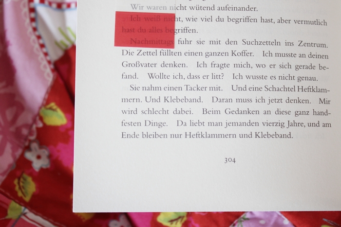 Wenn ich das Buch lese, will ich immer, dass ich ganze lange etwas davon habe und lese nur wenige Seiten am Tag. Irgendwie schwachsinnig…aber ich will einfach nicht, dass es zu schnell zu Ende ist. Ich finde, Foer hat einfach ein unglaubliches Erzähltalent, das durch die Gestaltung des Buches noch direkter wird. Man hat das Gefühl, direkt dabei zu sein. Zieht mit Oskar durch die Straßen New Yorks, erlebt mit seinen Großeltern diese seltsame, berührende Liebesgeschichte.