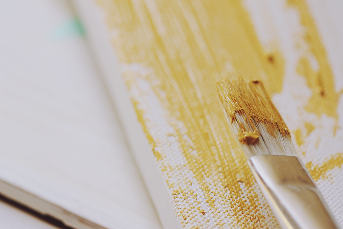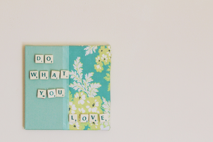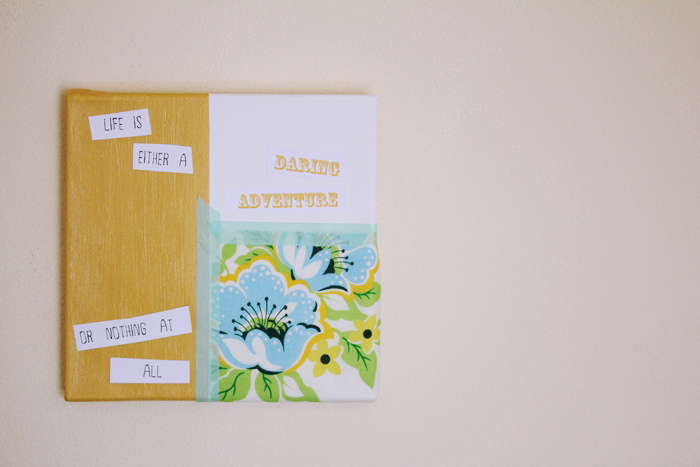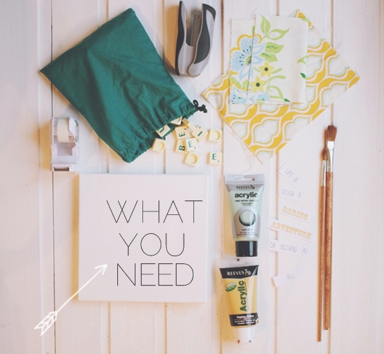 Alles was ihr dafür braucht ist eine kleine Leinwand (20×20 zum Beispiel), Acrylfarbe (am besten so eine, die euch förmlich anbettelt verwendet zu werden!), Stoffreste, Zitat aus Buchstaben (Scrabble oder ausgedruckte/selbst geschriebene), einen Pinsel, Klebeband, Masking Tapes, einen Tacker, eine Schere.