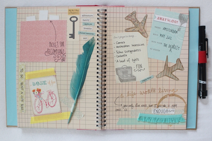 Als letzte Doppelseite für heute – es folgt bestimmt irgendwann mal wieder ein Post – eine Reiseseite für Amsterdam. Links wieder ein selbstgebasteltes Pocket für Reisetipps, dann ‘rent a cute bike’ steht eigentlich am Programm und rechts noch ein paar schöne Worte und Daten der Reise, auf der wir ja gerade sind.