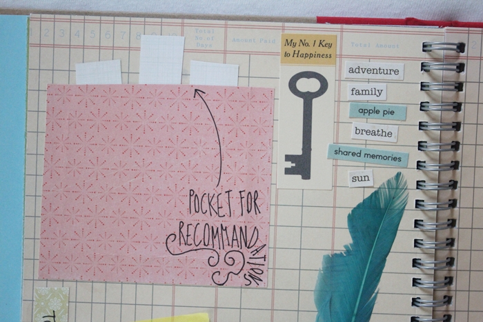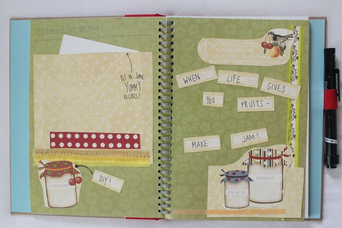 Auf dieser Doppelseite habe ich ein “Pocket” aus Scrapbookpapier gemacht, in das ich leckere neue Marmeladenrezepte stecken werde.