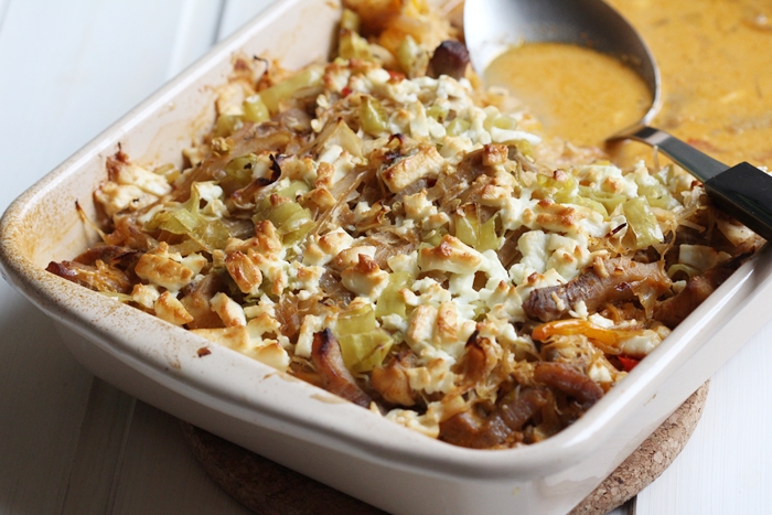 Den Pfanneninhalt in eine Auflaufform kippen, mit zerbröseltem Schafskäse und geschnittenen Peperoni bestreuen und bei 180 Grad Heißluft (vorgeheizt) ins Backrohr geben. Ca. 25-30 Minuten backen.