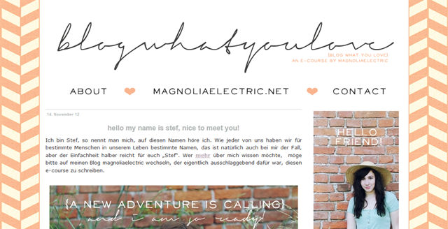 Ich habe all’ mein Wissen reingepackt (von tollen Fontseiten, über die Pro’s und Contra’s von Blogger, Typepad, WordPress und Tumblr, Fotografieratschläge, Bearbeitungsseiten – alles, was mir eingefallen ist) und versucht, aus verschiedenen Perspektiven an die einzelnen Lektionen heranzugehen. Wenn ihr meinen Blog mögt, dann denke ich, dass der e-course für euch richtig sein könnte – er spiegelt mich zu 100% wieder und ist dem Stil von magnoliaelectric angepasst.