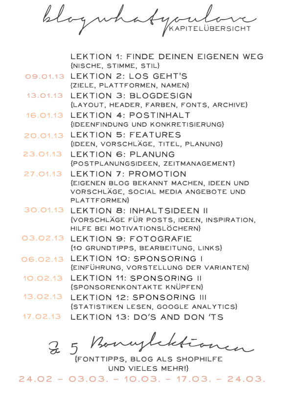 An wen richtet sich der Kurs? Eigentlich an alle Blogbegeisterten unter euch! Das können diejenigen sein, die schon einen Blog führen, aber unzufrieden damit sind oder auch welche, die noch mehr Tipps für die Grundstruktur haben möchten oder auch an die stillen LeserInnen, die mir öfter schreiben, den Gedanken zu haben, mit dem Bloggen zu beginnen, aber nicht wissen, wo sie anfangen sollen. Durch die Übersicht der Lektionen könnt ihr vielleicht herausfiltern, ob der Kurs für euch noch wichtig ist oder ihr davon sowieso schon alles im Schlaf wisst. Ich möchte mit dem e-course auf keinen Fall eine Anleitung geben, wie man einen “guten” Blog schreibt, sondern in den obrig angeführten Bereichen mein Wissen (und Erfahrungen) zu sammeln, das dann je nach Persönlichkeit aufgenommen werden und weiter verarbeitet werden kann.