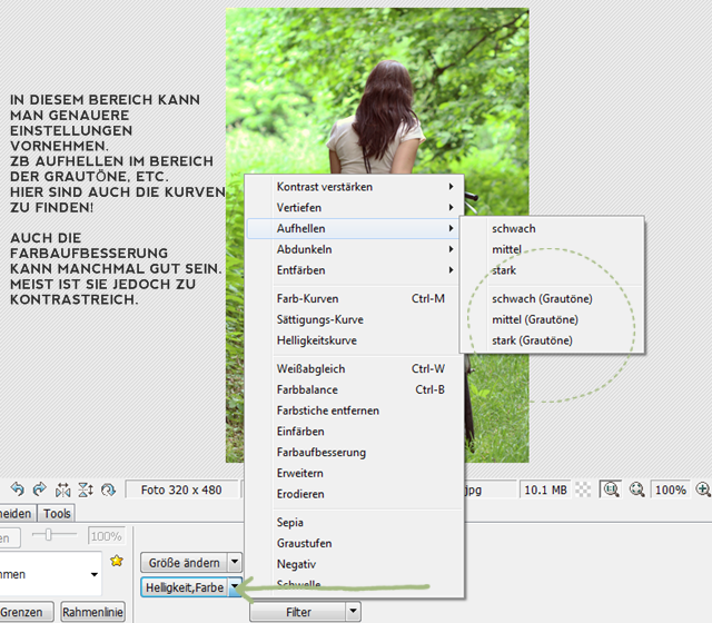 Als erstes ruft ihr von der Bar unter dem Foto “Helligkeit, Farbe” auf – klickt direkt darauf. Es erscheint ein Kästchen.