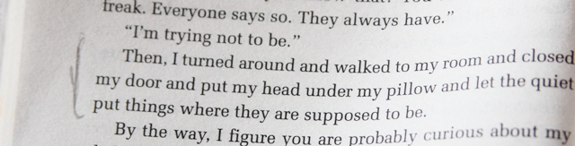 Ja, der Protagonist ist Charlie. Dass er fünfzehn ist stimmt auch, dass er labil und introvertiert ist, ebenfalls. Aber da steckt noch so viel mehr dahinter. Charlie spricht nicht eine unbekannte Person an. Er schaut einem mitten ins Herz, wenn er an dich, den Leser, schreibt. Er sieht, was du denkst, er fühlt mit dir und du mit ihm. Meine Augen rasten nur so über die Seiten, meine Hand machte so oft Striche und Bemerkungen in das Buch, denn es wurde zu einem großen Lebensinhalt für mich. Ich blättere es so oft auf, lese was ich dazu geschrieben habe, es ist wie ein Tagebuch, dass ich neben den Briefen von Charlie, geführt habe. Vieles findet sich auf Post-its vor, die ich dann herausgenommen habe. Bisher habe ich das Buch noch nie verborgt und ich bin mir auch nicht sicher, ob ich möchte, dass genau dieses – mein – Exemplar irgendjemand mal zu Gesicht bekommt.