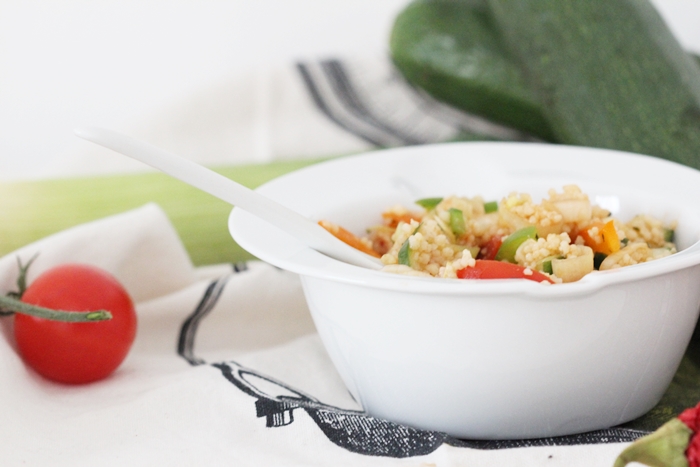 Das Gemüse waschen und würfelig schneiden, den Lauch in feine Ringe. Den Couscous nach Packungsangabe zubereiten (meist Wasser erwärmen, Gemüsebrühenwürfel dazu, yum! Couscouskörner dazugeben, aufquellen lassen, einen TL  Butter einrühren, nochmals 1-2 Min. aufkochen). Alles zusammenmischen.