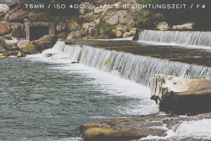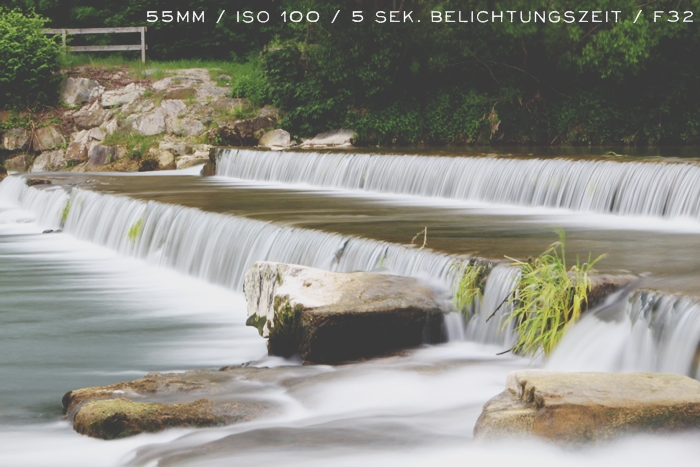 Das Wasser wird sehr weich und fließend, ein bisschen nebelig sein. Freihand bekommt man das nicht hin, weil man zu sehr wackelt. Wie ihr seht, muss die Blende aber sehr hoch eingestellt sein, dh, es kommt nur wenig Licht durch > Da die Verschlusszeit so hoch ist, wird das bild sowieso hell, darum Blende ebenfalls hochstellen (= weniger Licht).