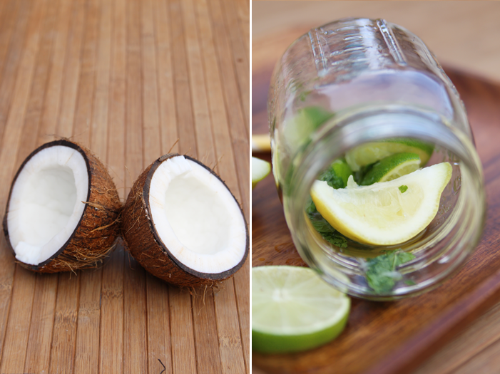 Die Limetten und Zitrone schneiden und mit einem Mörser den Saft rauspressen. Die Minze waschen, die Blätter halbieren und dazustampfen. Auf die beiden Gläser aufteilen (samt Schale) und mit Kokosnusswasser und Mineralwasser, beides im Idealfall kühlschrankkalt, aufgießen. Je 2 EL Rohrzucker hinzugeben, der setzt sich dann unten ab und bleibt eigentlich bis zum Schluss übrig. Durch das Umrühren beim Trinken, gibt er dem Getränk eine leicht süßliche Note.
