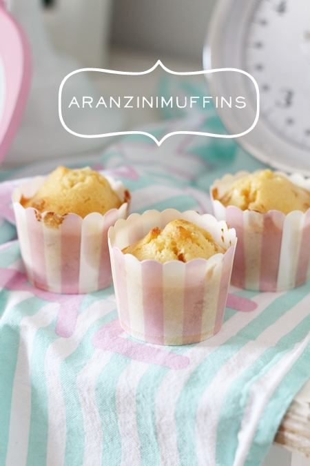 & noch zum Abschluss die Muffins, die pseudomäßig Frucht, nämlich Orange, in sich haben. Wir denken jetzt nicht dran, dass Aranzini kandierte Orangen sind, das heißt Zucker hoooch und Wasser weg. Schmecken tun sie trotzdem!