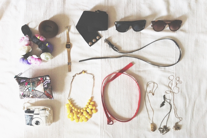 Eine kleine Tasche zum Fortgehen (nicht abgebildet), die zu allen Kleidern passt. Natürlich ist es Sommer, sodass zwei Sonnenbrillen (braun und schwarz) auch dazugehören.