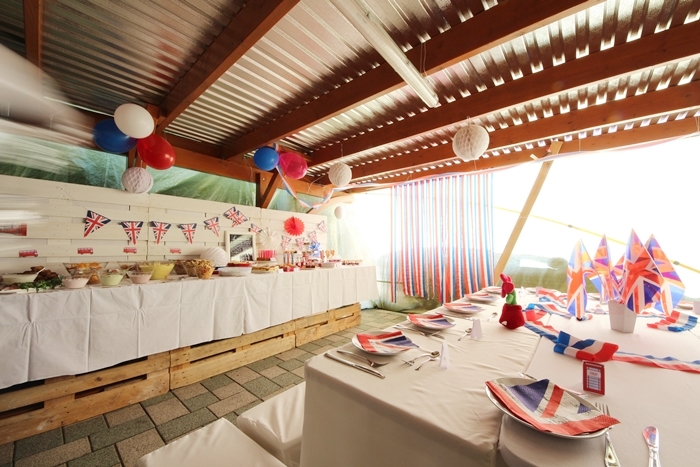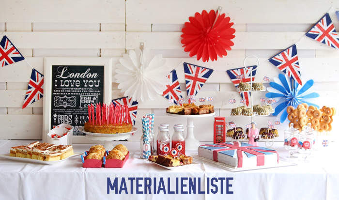 Kleiner Tortenständer, Union Jack Wimpel, Pompoms, Wabenbälle und Fächer, kleine Unionjack-Fähnchen, Unionjack-Servietten, Strohhalme blauweiß und rotweiß, sowie weiße, rote und blaue Luftballons: c/o Party Princess