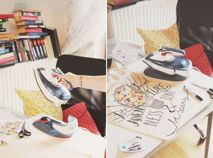 Die erste Aufgabe, der ich mich stellen musste, war ein leeres Säckchen / Totebag, das ich mit mitgeschickter Bügelfolie aufhübschen sollte. Ich wählte aus den unterschiedlichen Möglichkeiten eine bunte geometrische Folie aus, die ich anschließend noch etwas oval zuschnitt. Mit dem spacigen Bügeleisen Freemove 9920*, das Tefal ebenfalls beipackte, bügelte ich also wild drauf los.