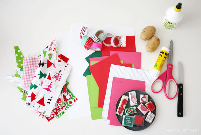 Nehmt Masking Tape und klebt es in Form von weihnachtlichen Ornamenten auf die Karten, schnitzt Euch aus den Kartoffeln schöne und einfache Motive, nutzt Eure Stempel (aus Radiergummis) oder schnappt Euch Stoffreste, um tolle Karten zu machen.