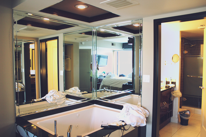 * Tipp 2: Bucht Vegas so früh als möglich! Wir zahlten für ein 4-Sterne-Hotel, welches unglaublich schön war, ohne Frühstück, für eine Juniorsuite (mit Whirlpool und tollem Bad und Küchenzeile und Ausblick auf den Minieiffelturm des Paris-Hotels und das Caesars Palace) 160€ pro Person –  für fünf Nächte! Das sind 32€ pro Person pro Nacht, für ein Luxushotel! So viel zahlten wir in anderen Städten in Hostels! Desto später man bucht, umso teurer werden die Preise. In der Hochsaison ist dann auch schon viel ausgebucht.
