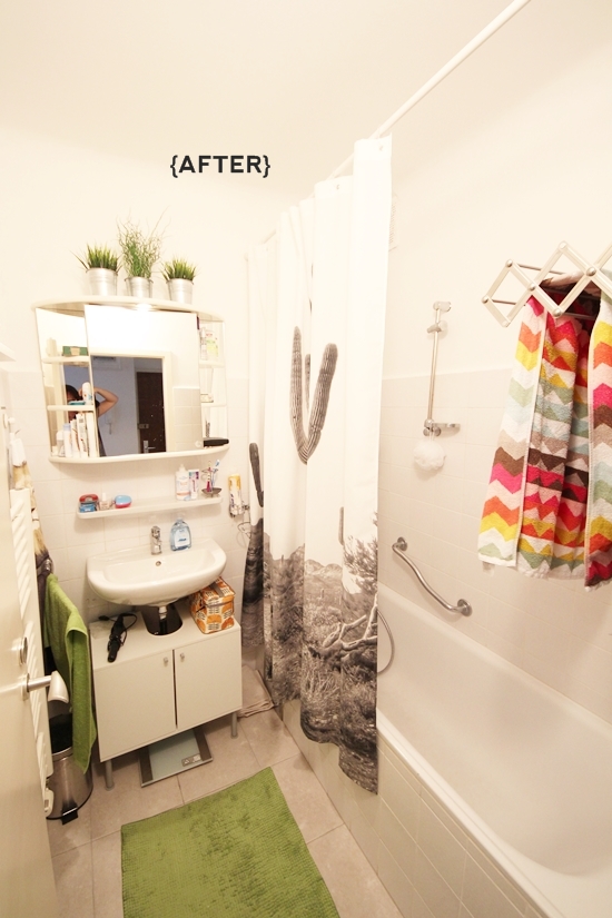 * Weiß streichen! Auch wenn das Bad sowieso weiß gestrichen war, strichen wir nochmals zwei Schichten darüber. Auf Fotos sieht man den Unterschied kaum, aber in echt wirkte es viel heller und auch gleich um einen gefühlten halben Quadratmeter größer.
