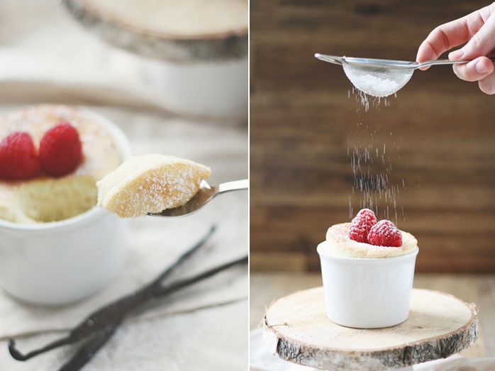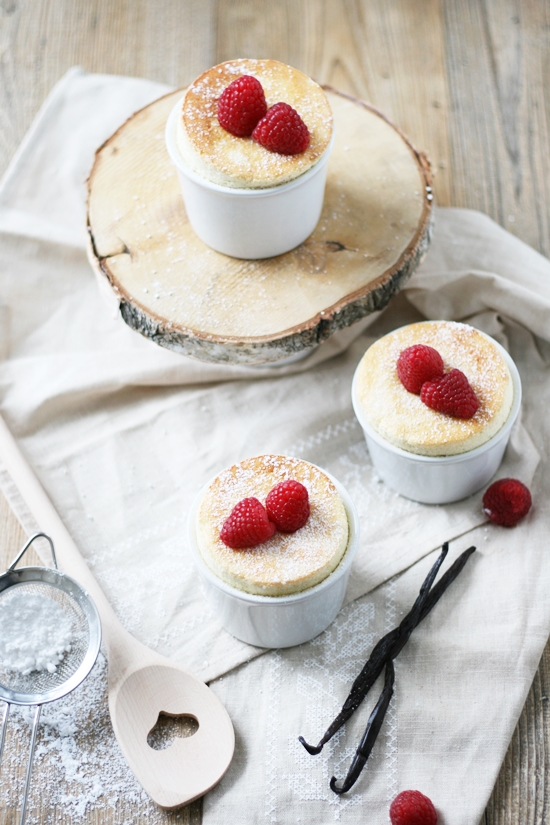 Beginnen wir das erste he cooks – she shoots mit einem einfachen Vanille-Soufflé. Wir haben beide noch nie selbst eines gemacht und ich denke auch keines gegessen? Die Fotos mit den feinen Häubchen, die keck über den Rand abstehen, waren mir jedoch wohl bekannt. R hielt sich genau an das Rezept und es gelang auf Anhieb! Die Soufflés wurden sehr fluffig, jedoch nicht zu luftig. Die Vanillenote kam sehr gut heraus, daher unbedingt eine echte Vanilleschote verwenden. Der Eigeschmack drang aber vielleicht eine Spur zu stark durch, sodass ich mir beim Essen noch weitere Himbeeren untermischte. Die leicht säuerliche Note der Früchte harmonierte super.