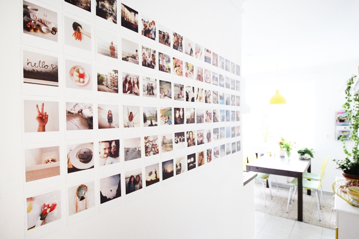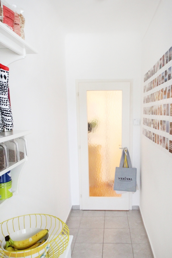 Die Küche beginnt mit einem kleinen länglichen Gang, der einen fast eigentlich unnötigen Raum darstellt. Es ist so schmal, dass nur die Tür aufgeht und kein Wandregal parallel Platz hat. Ein Highlight der Küche ist aber mit Sicherheit unsere Origrami-Polaroid Fotowand, die jeder bestaunt! Die Fotos sind mit ganz kleinen doppelseitigen Klebepunkten (vier pro Bild) an der Wand angebracht.