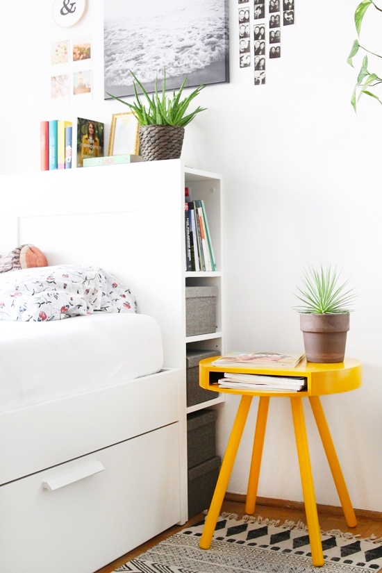 Am schwierigsten war es, dem Zimmer Farbe zu geben. Da Weiß dominierte zu sehr, Bett, Kopfteil des Betts, die Wände, das Fensterbrett und die Fenster, das Leintuch, die Bilderrahmen und so weiter.. mir gefiel dieser “übercleane” Look nicht, den ich eher als steril und unfertig empfand, nicht als bloggeresque kühl und ästhetisch. Dadurch, dass das Bett nur 1,40m breit ist, wirkte es durch das Kopfteil sehr schmal. Das kleine Nachtkästchen mit erneutem Farbtouch (jup, Gelb…) zieht optisch die Ecke ein wenig in die Breite. Der leichte Vintagetouch lenkt ein bisschen von den häufig vorkommenden Ikeastücken ab. Meine Devise: Schlicht und kostengünstiges Einrichten ist dann toll, wenn man abwechselnd dann ein paar “Eyecatcher” unterbringt.