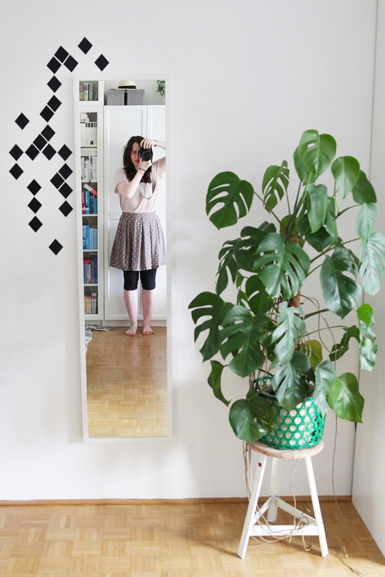 Hier befindet sich mein Kleiderkasten mit meiner Lieblingspflanze, weil ich sie seit über einem Jahr besitze und sie noch immer lebt, trotz Umzug. Ein schlichter Spiegel mit Karostickern ergänzt die Wand. Der Kleiderkasten ist relativ groß (und noch immer zu klein husthust..), vielleicht ergänze ich die Milchgläser innen mal durch farbig passendes Papier. (Vielleicht. Irgendwann. Bald einmal = sprich nie…)