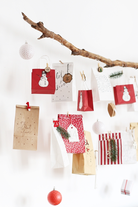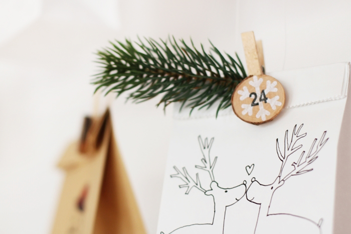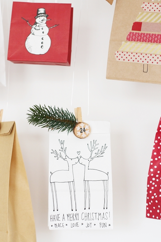 Die Säckchen könnt ihr gestalten, wie ihr möchtet. Sucht Farben, die harmonieren, die euch gefallen oder gut in eure Wohnung passen. Ich habe relativ viel Weihnachtsinspiration auf meinem “christmas”-Pinterestboard gesammelt, wenn ihr mal stöbern möchtet. Wir entschieden uns für traditionelle, warme Farben. Die schlichten Papiersäckchen verzierten wir noch mit diversen Schriftzügen und kleinen Zeichnungen. Inspiration dafür holte ich mir auch von Pinterest mit den Suchwörtern “christmas doodle”.