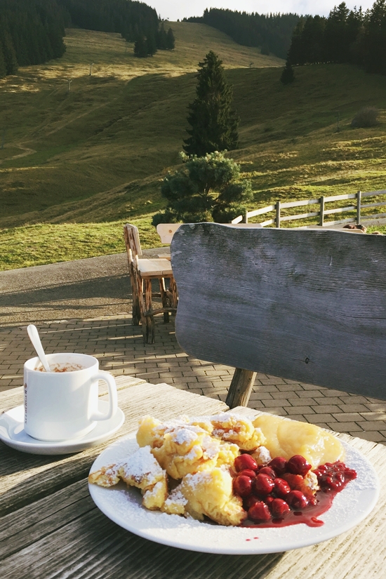 Anschließend gönnt man sich noch einen Kaiserschmarrn mit Apfelmus und Kirschen oder ein Germknödel mit tollem Ausblick, die Hütte befindet sich gleich daneben.