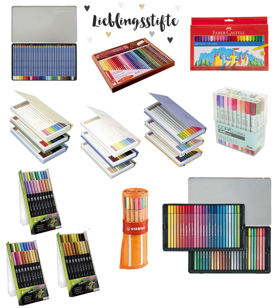 Weil ich auch oft Fragen bekomme, welche Stifte ich generell nutze, auch für Kalendereinträge und sonstiges, zeige ich euch hier diejenigen, die ich für die Ausmalbücher gerne benutze. Achtung, es sind auch sehr teure Varianten dabei, die sich im Laufe der Jahre angesammelt haben. Am besten startet ihr mit einem netten Set an Buntstiften und Faserlinern, bevorzugt ihr dickere Spitzen, dann würde ich zu den Filzstiften greifen. Nach und nach könnt ihr ja an Farben aufstocken!